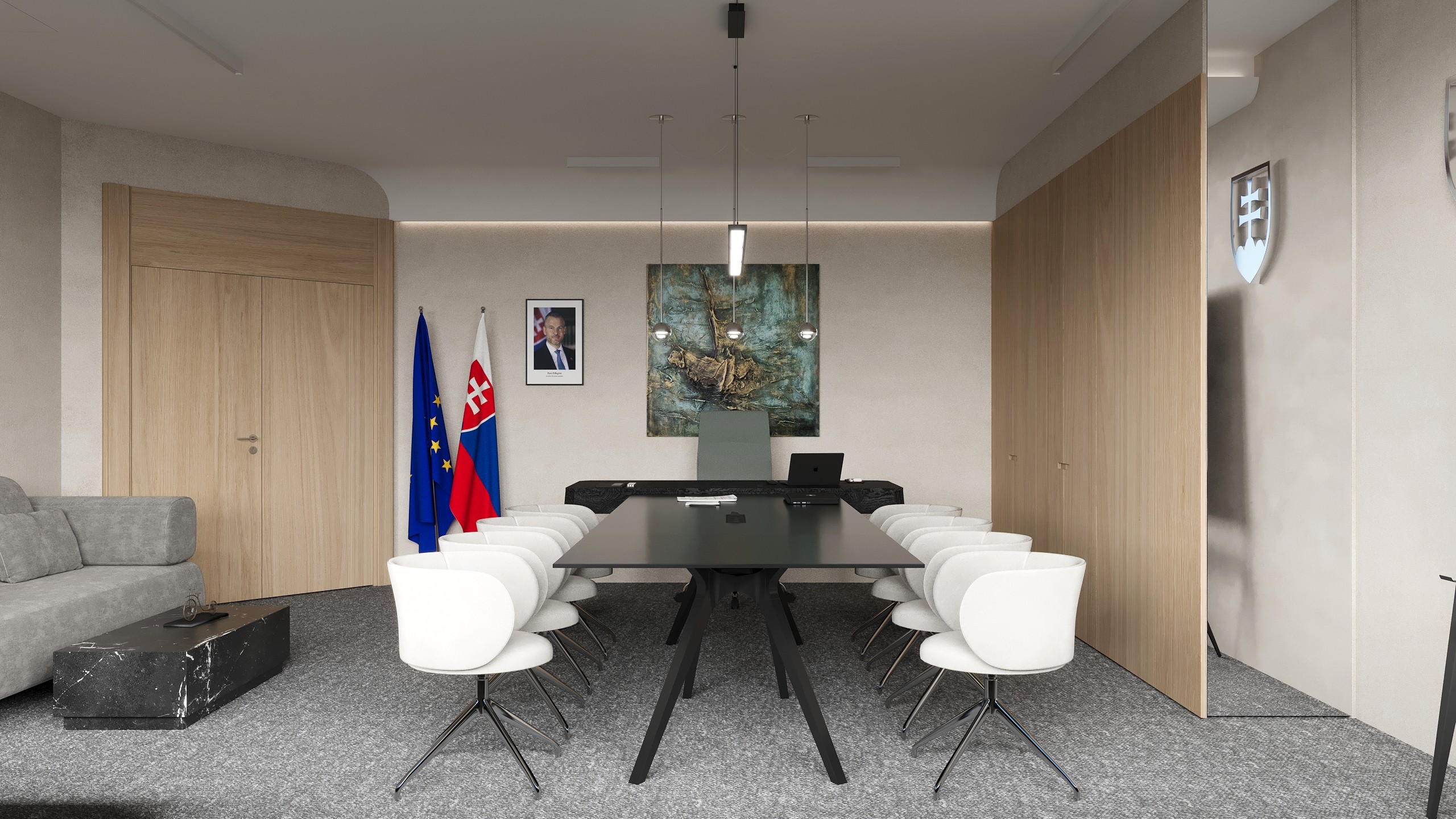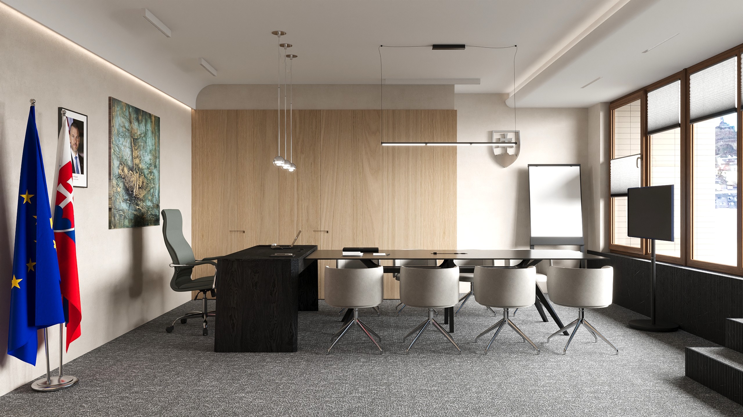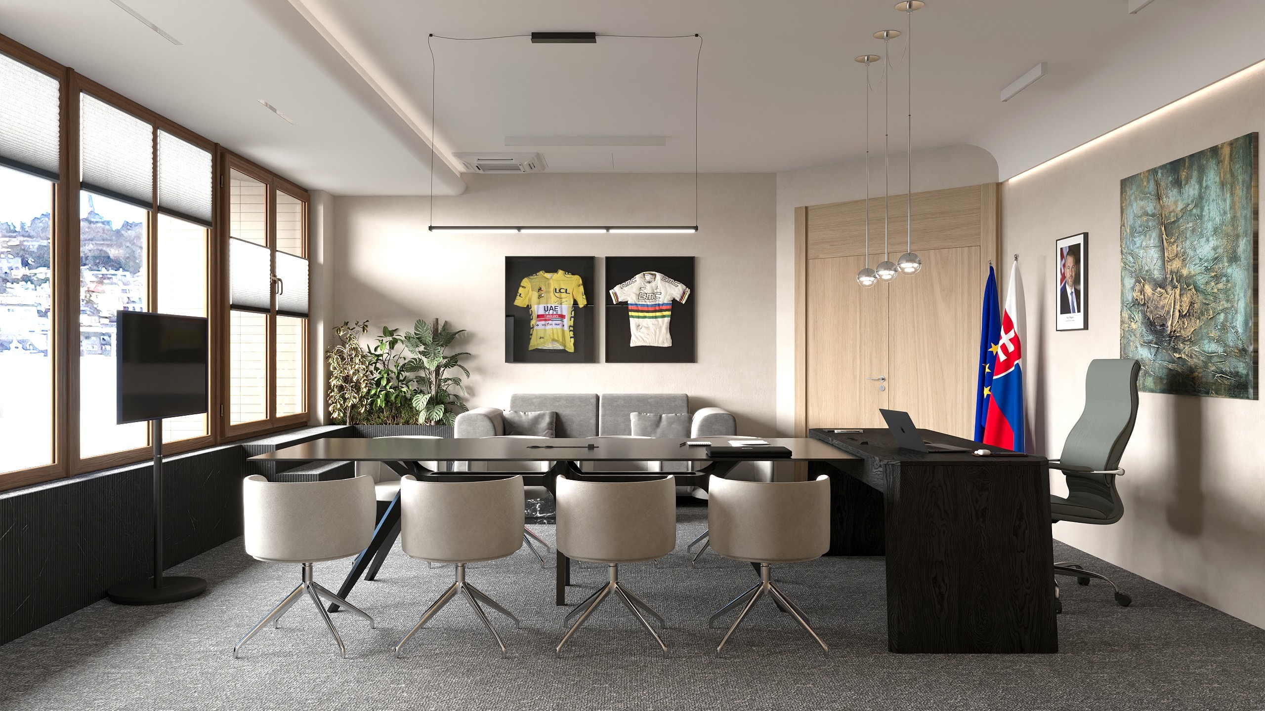 Návrh kancelárie výkonného vedenia s panoramatickým výhľadom na bratislavský hrad a Slavín, ktorý bol hlavným predmetom dispozičného riešenia.