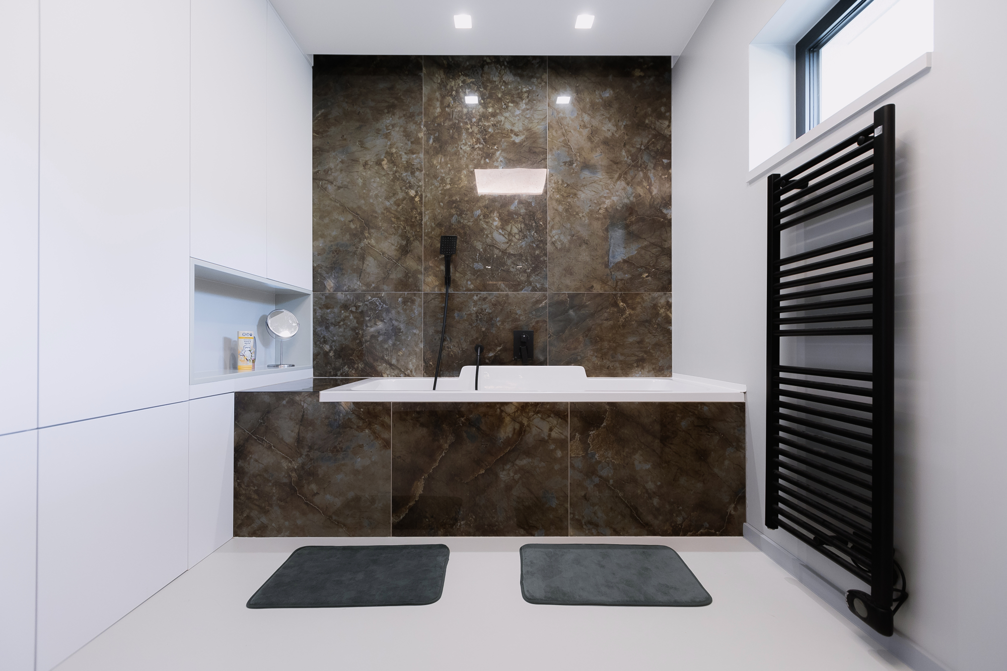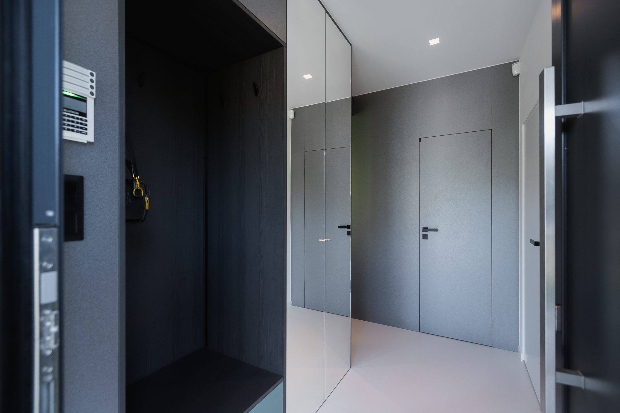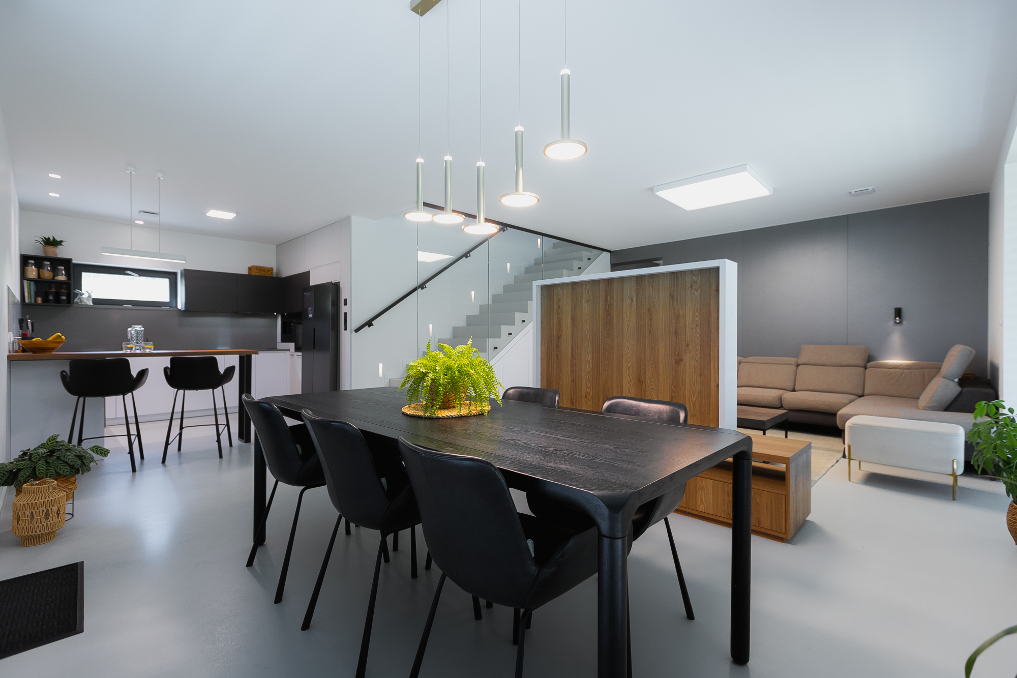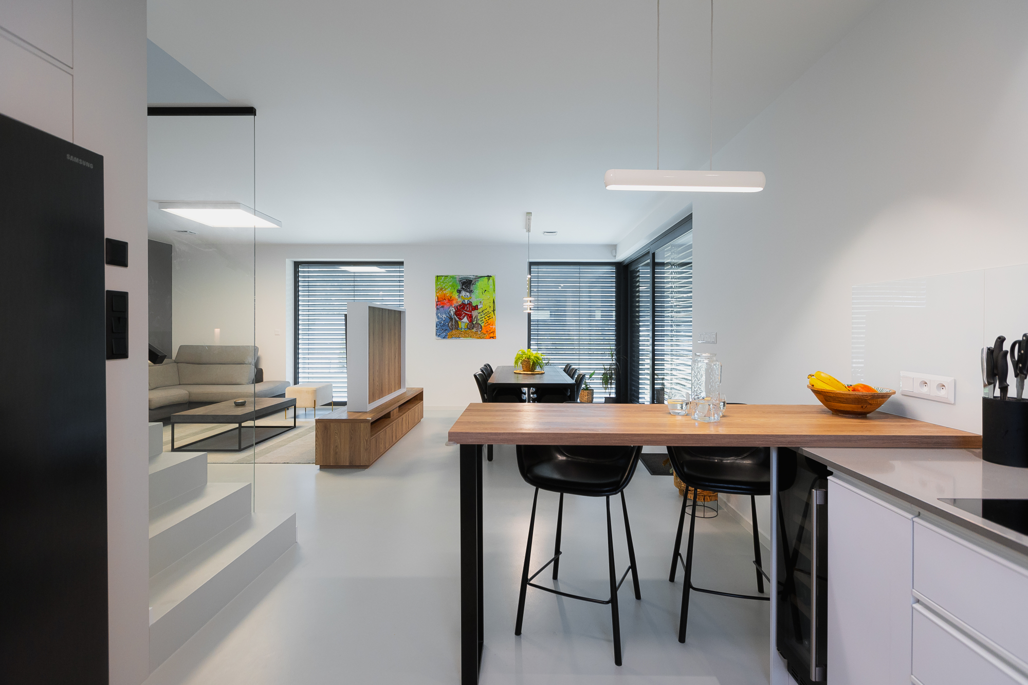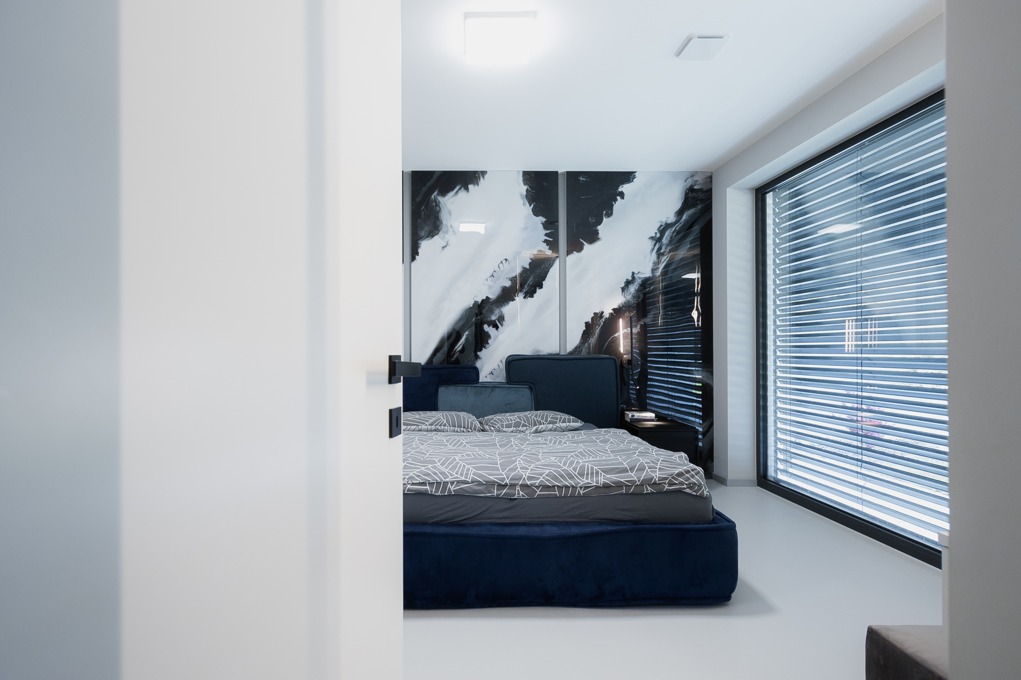 Monochromatický interiér s malými farebnými akcentami. Majitelia si priali moderný a funkčný interiér, čo najviac uzavretých plôch a bezšpárové podlahy. Zo spálne a obývacej izby sú mimochodom nádherné výhľady na oravskú prírodu.